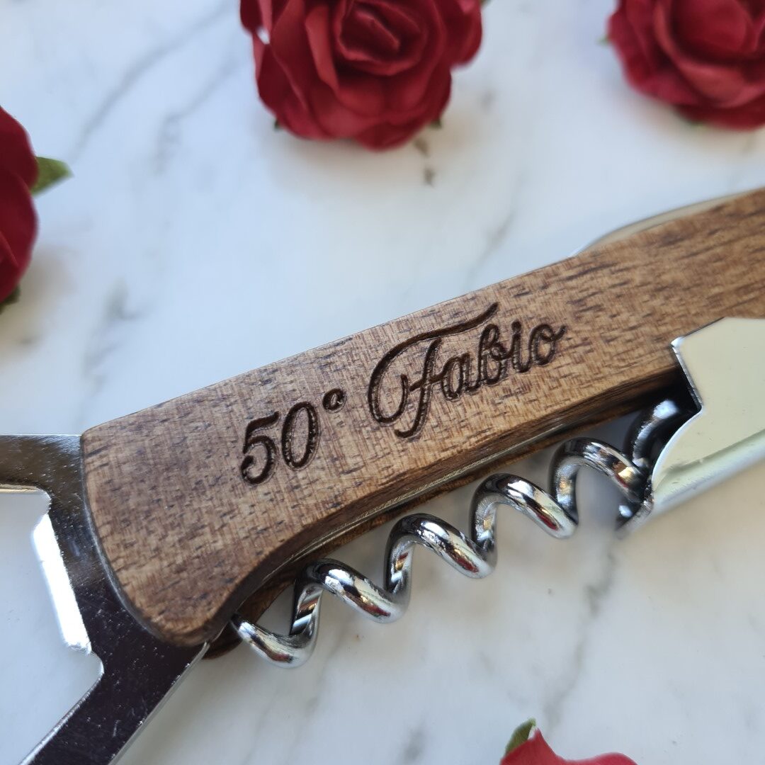 Elegante, pratico e perfetto come idea regalo personalizzata, questo cavatappi multifunzione è realizzato in legno naturale con dettagli in metallo e può essere inciso con nome, data, numero o breve frase.