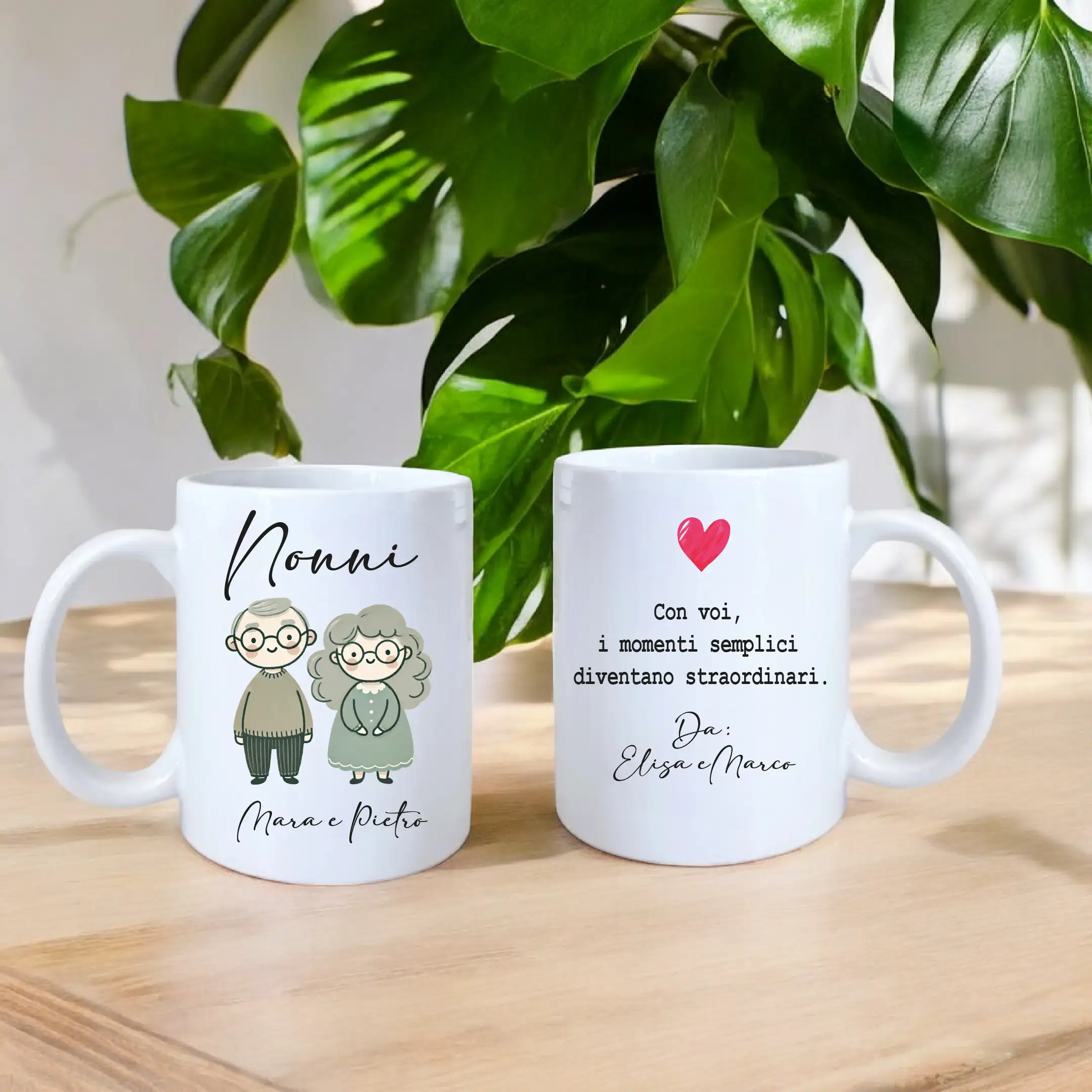 Celebra i tuoi nonni con un regalo che parla al cuore: una tazza bianca che puoi personalizzare con un disegno a scelta e una dedica speciale, un nome o una frase affettuosa.
