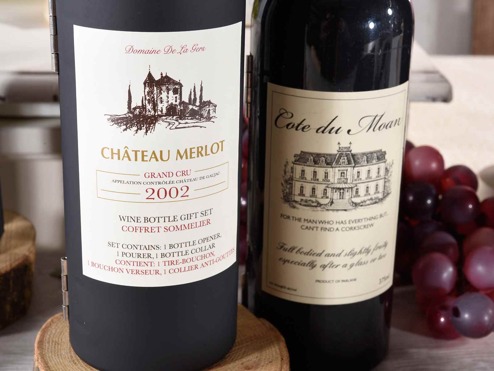 Bottiglia con 3 accessori da sommelier per il vino