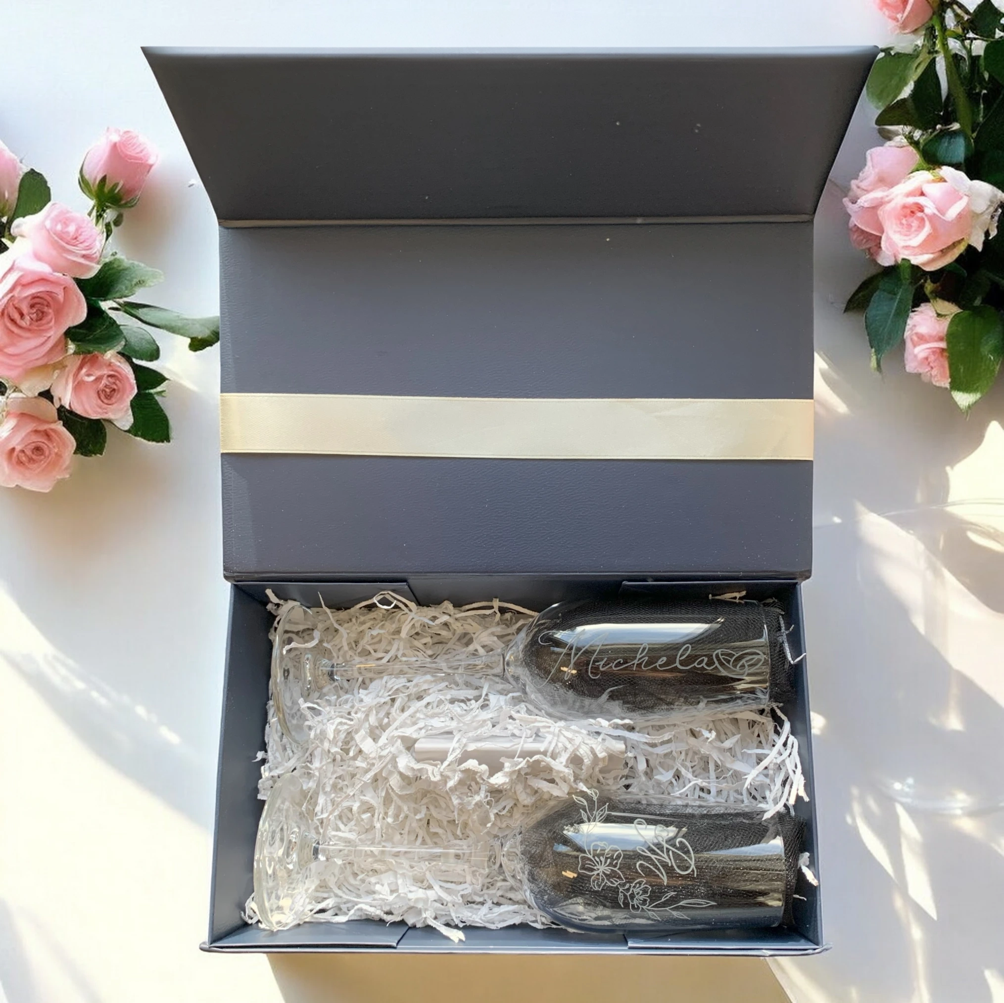 Sorprendi gli sposi con un’elegante scatola regalo, perfetta per custodire i loro flute personalizzati. Questa raffinata box può essere personalizzata con i nomi della coppia sulla parte esterna, mentre all’interno puoi aggiungere una frase speciale, rendendo il regalo unico e indimenticabile.