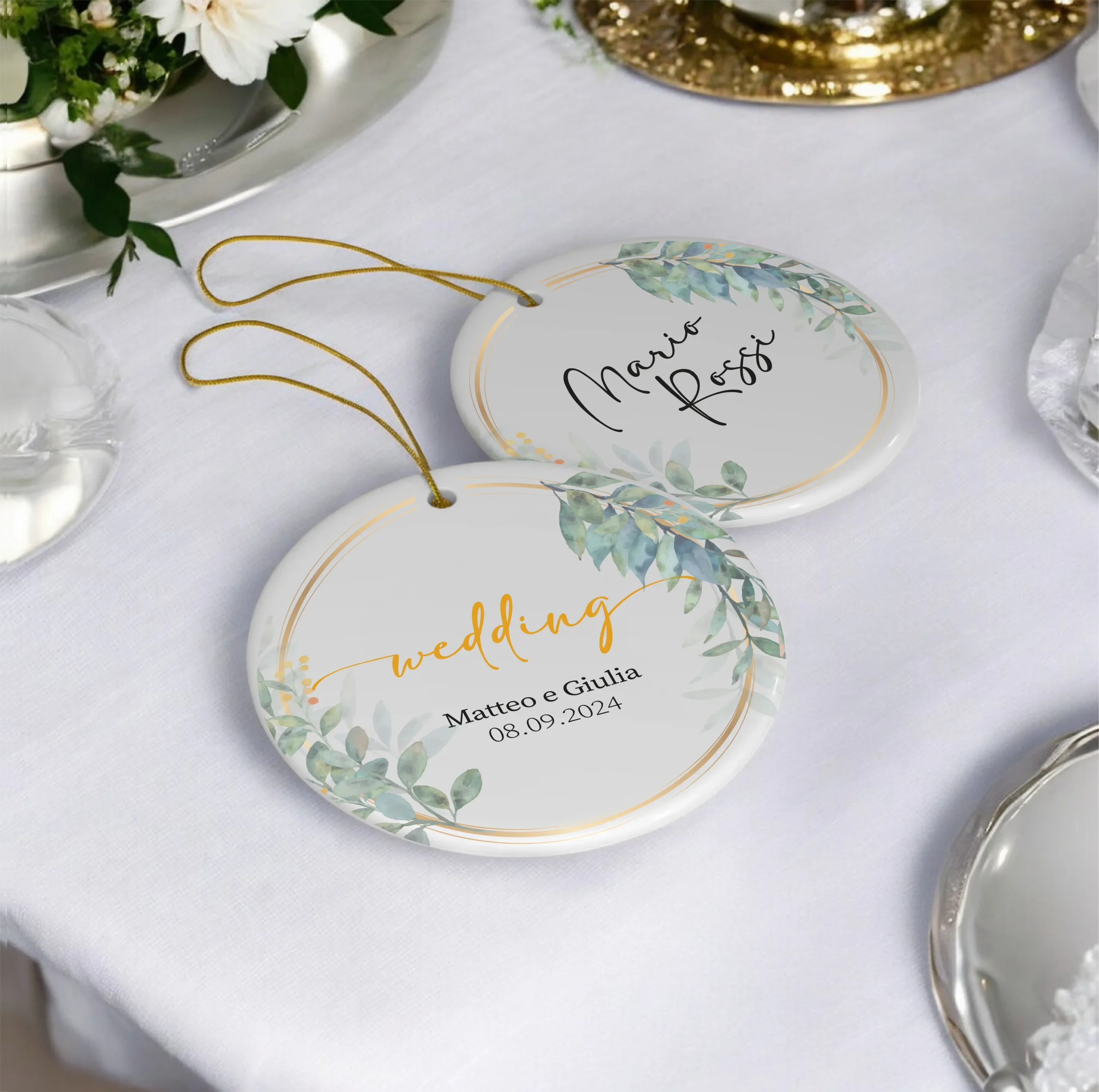 Una raffinata bomboniera in ceramica, ideale come segnaposto di matrimonio, con i nomi degli sposi e la data dell’evento stampati sul fronte in un design elegante e personalizzato. Sul retro, verrà aggiunto il nome di ciascun invitato, trasformando il segnaposto in un ricordo unico e funzionale. Questo oggetto esclusivo non solo impreziosisce la tavola con un tocco di classe e originalità, ma si presenta anche come un dono speciale di ringraziamento per gli ospiti, perfetto per celebrare il vostro giorno indimenticabile.