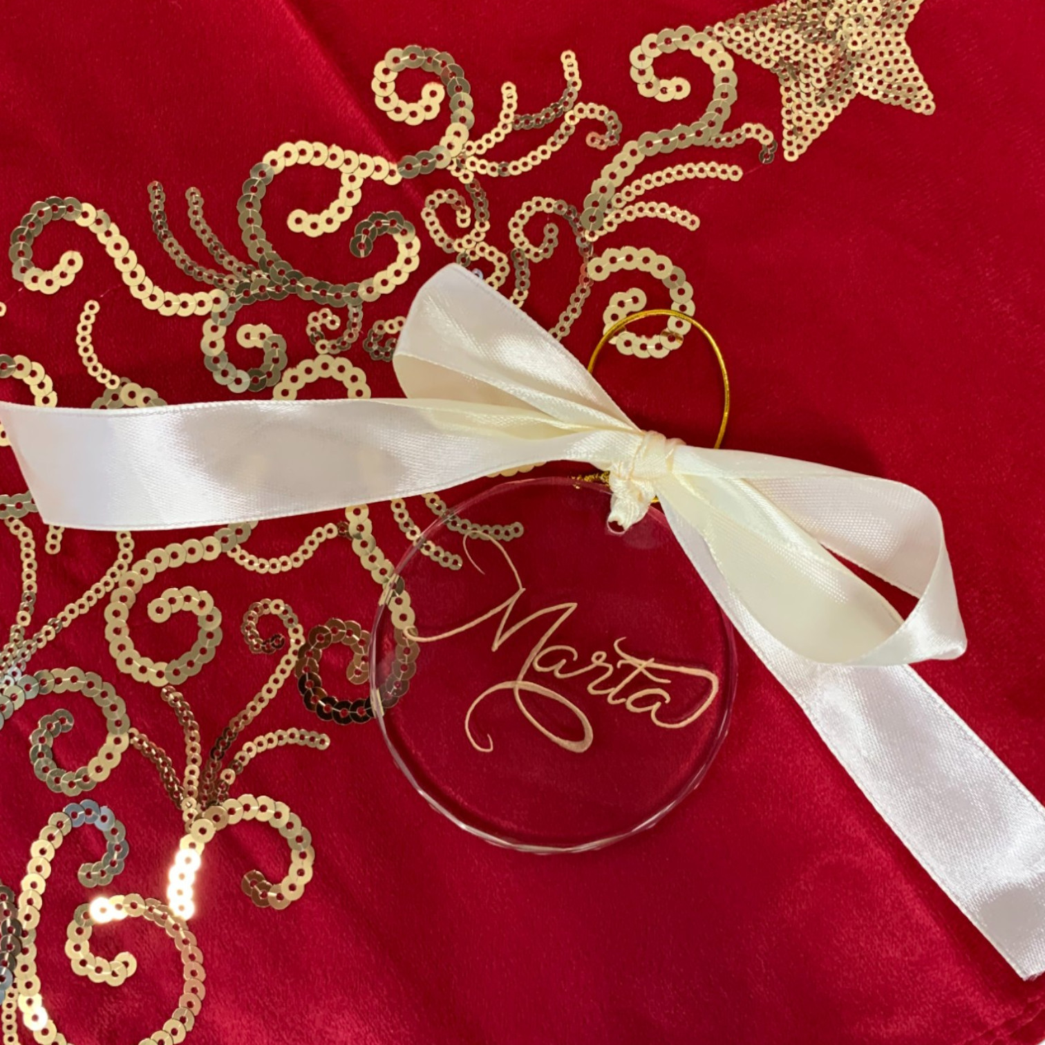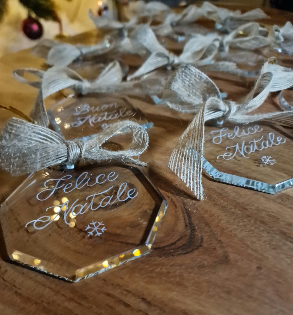 Questi eleganti segnaposto in vetro, personalizzati con incisioni a mano, offrono una doppia funzione perfetta per le festività e occasioni speciali. Possono essere utilizzati come segnaposto raffinati per cene o eventi importanti, oppure trasformati in splendidi ornamenti da appendere all’albero di Natale, aggiungendo un tocco unico e personalizzato alle tue decorazioni natalizie.