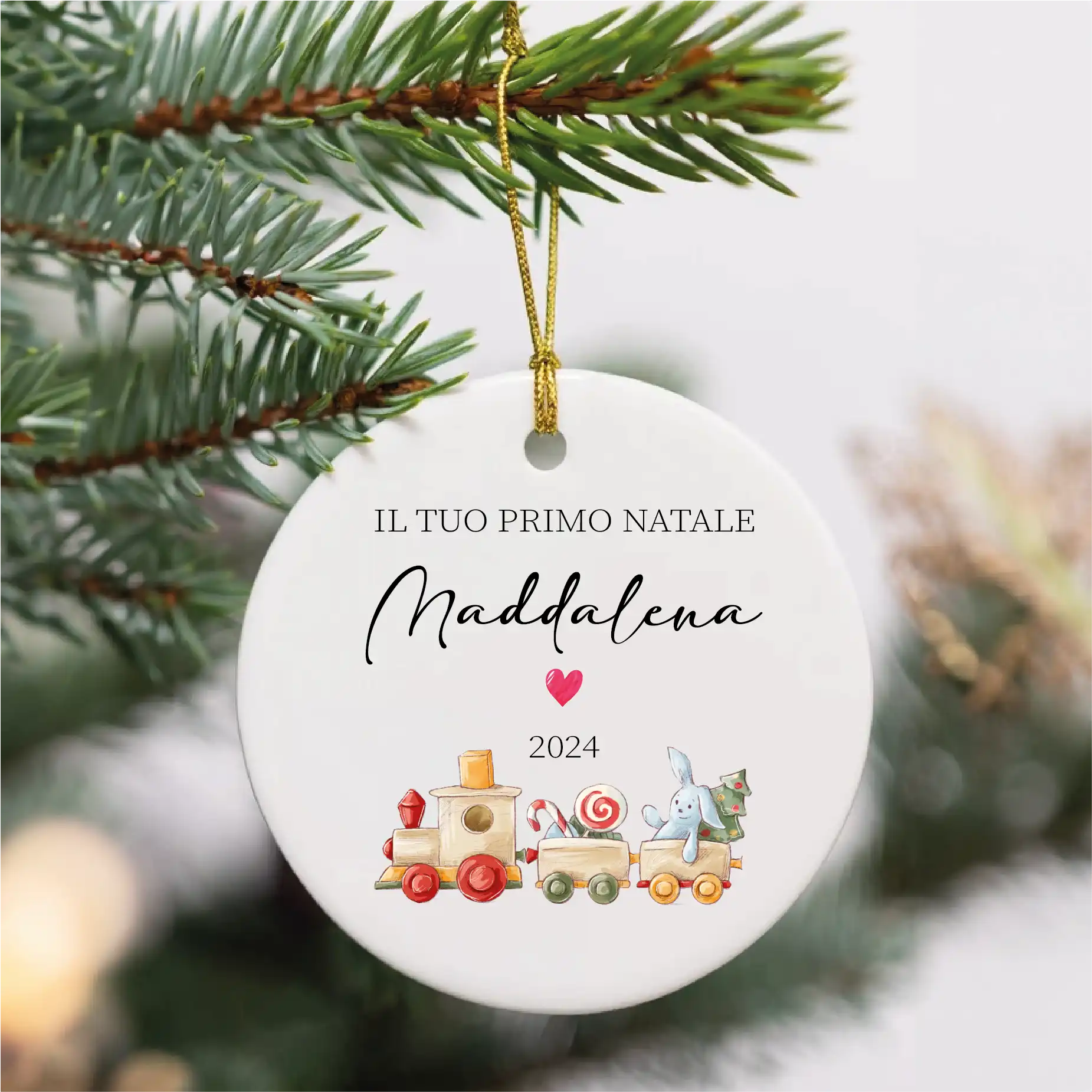 Questo dolce ornamento natalizio, inciso con la frase “Il Tuo Primo Natale” seguito dal nome personalizzato, è il regalo perfetto per celebrare il primo Natale di un neonato o una neonata. Decorato con un delizioso trenino giocattolo e l’anno, questo ornamento sarà un ricordo prezioso da appendere all’albero di Natale. Realizzato con cura e personalizzabile, è un modo speciale per commemorare un momento indimenticabile e aggiungere un tocco affettuoso alle festività natalizie.