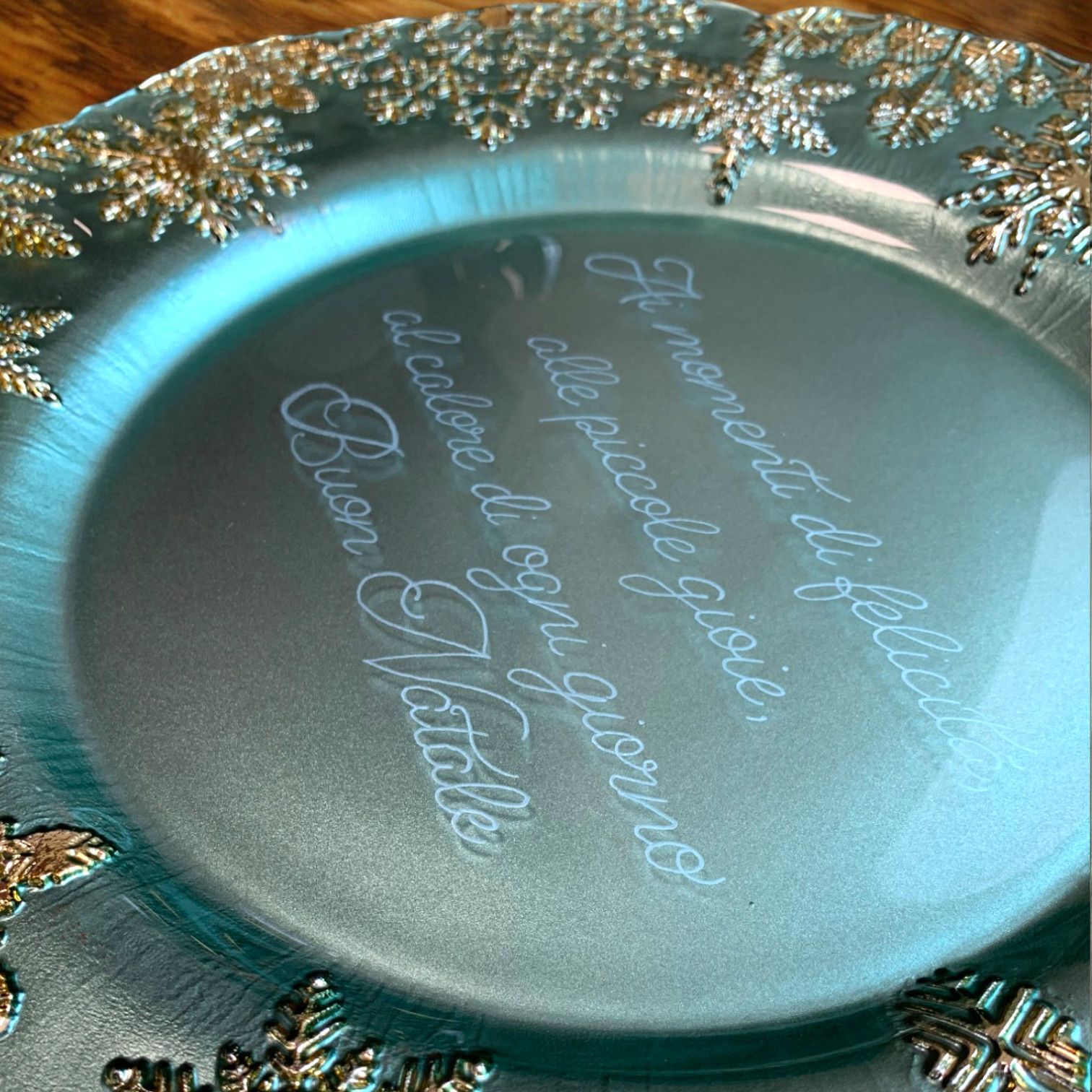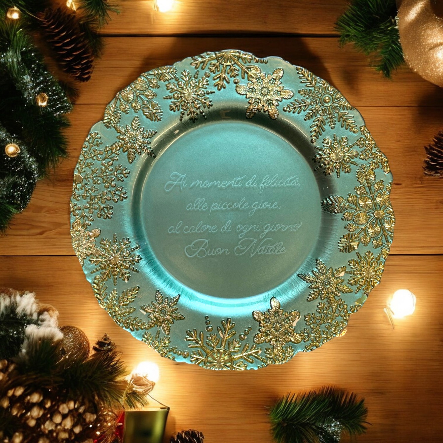 Questo elegante piatto verde in vetro è decorato con rilievi dorati, raffiguranti fiocchi di neve dettagliati che adornano il bordo. Il piatto è perfetto per occasioni speciali, come le festività natalizie, e offre la possibilità di personalizzare il centro con l’incisione di una frase a scelta, rendendolo un oggetto unico e significativo. Ideale per decorare la tavola o come regalo speciale, questo piatto unisce raffinatezza e personalizzazione, donando un tocco festoso e ricercato a qualsiasi ambiente. ATTENZIONE, in caso di riempimento dell’incisione utilizzare il piatto esclusivamente a scopo decorativo Misure: Ø 32,5 cm