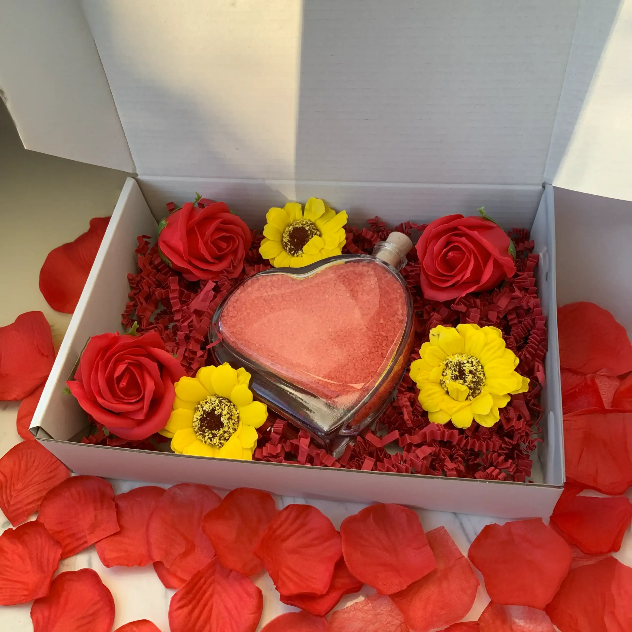 Rendi unico il tuo momento di relax con questa bottiglia a forma di cuore, personalizzabile con un’incisione di un nome o una frase speciale. Riempita con 130 g di sali da bagno colorati, questa creazione combina estetica e funzionalità, offrendo un tocco esclusivo e creativo.