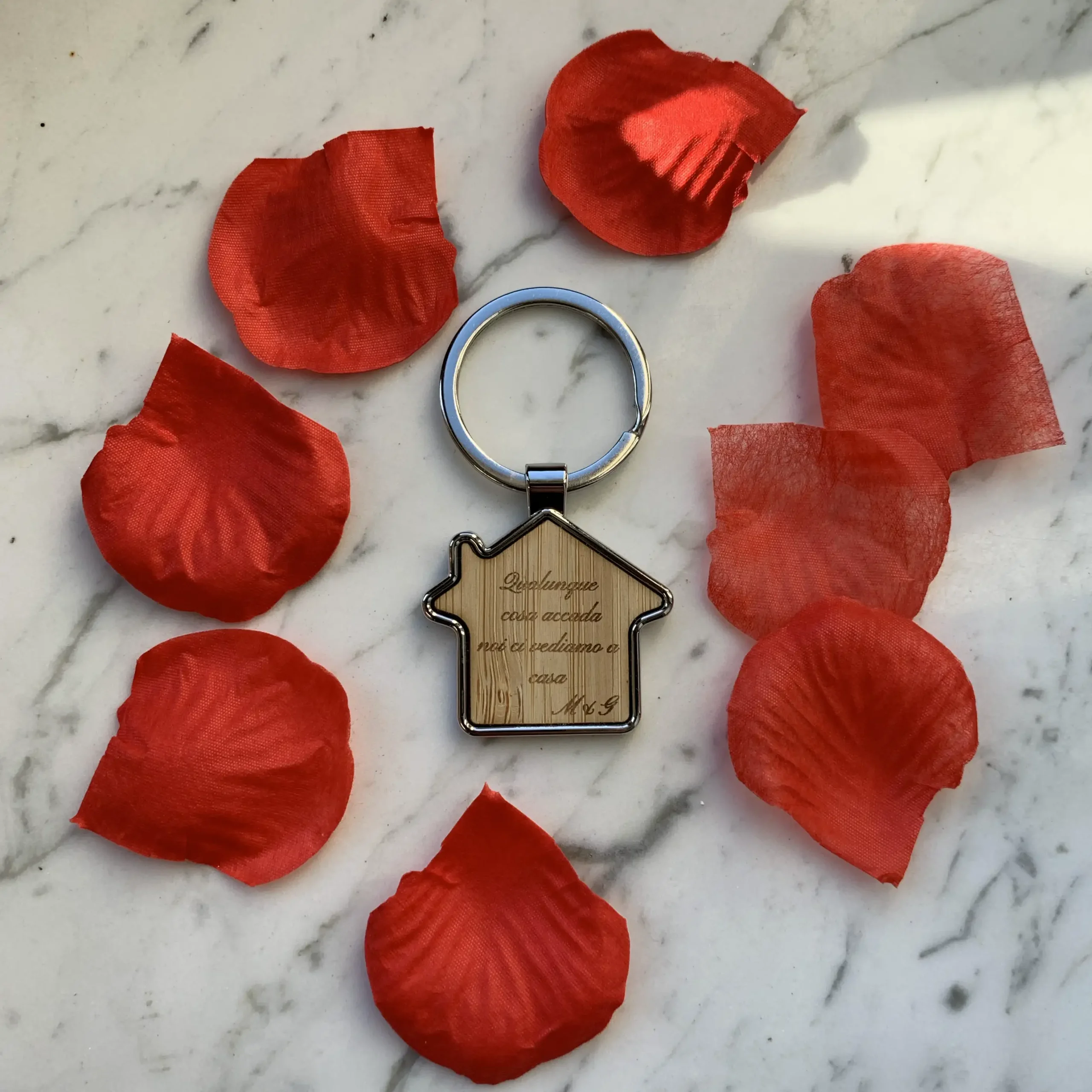 Un portachiavi unico a forma di casa, realizzato con dettagli in legno e metallo, inciso con un messaggio speciale o le iniziali di chi ami. Un regalo perfetto per celebrare legami importanti e portare sempre con sé il calore di casa.
