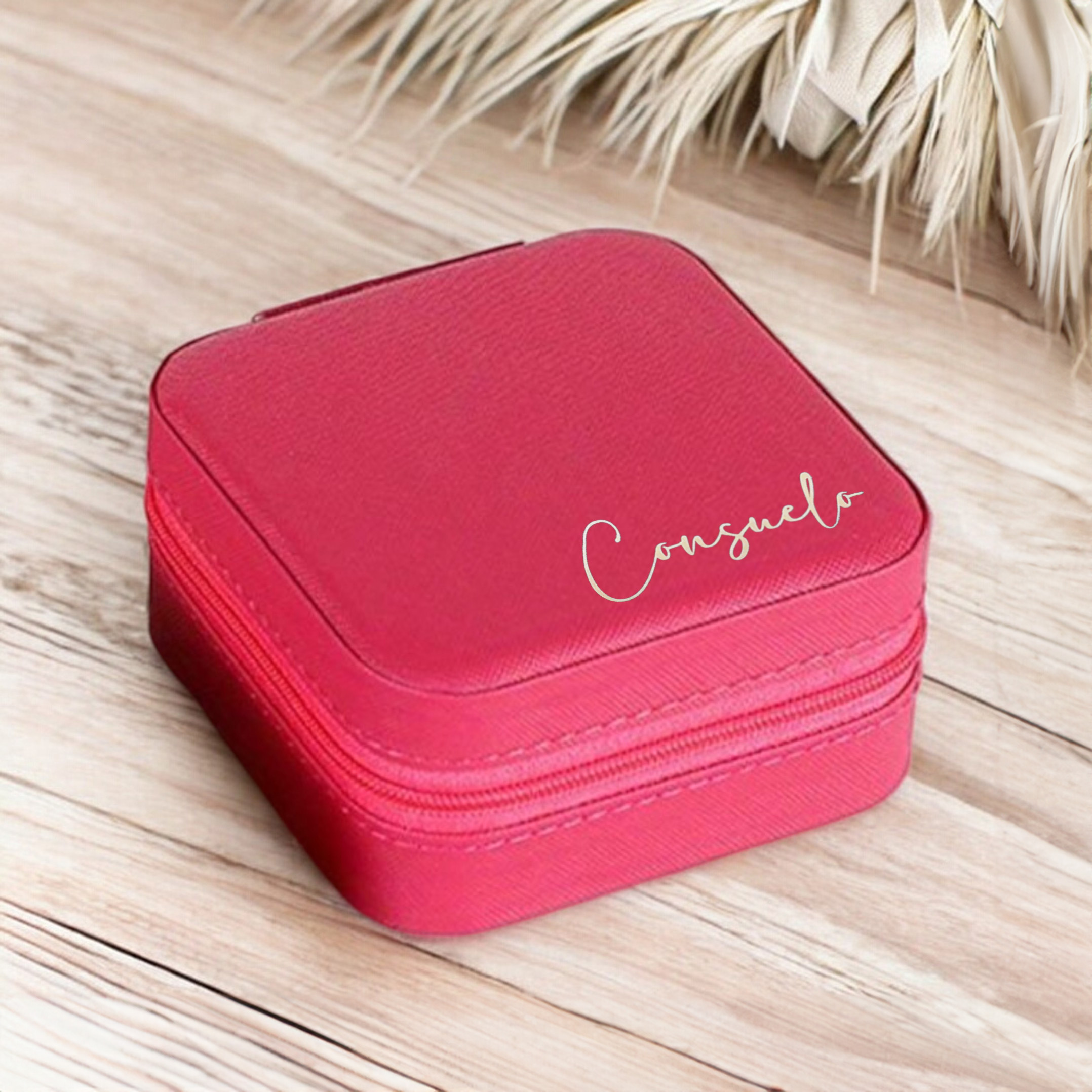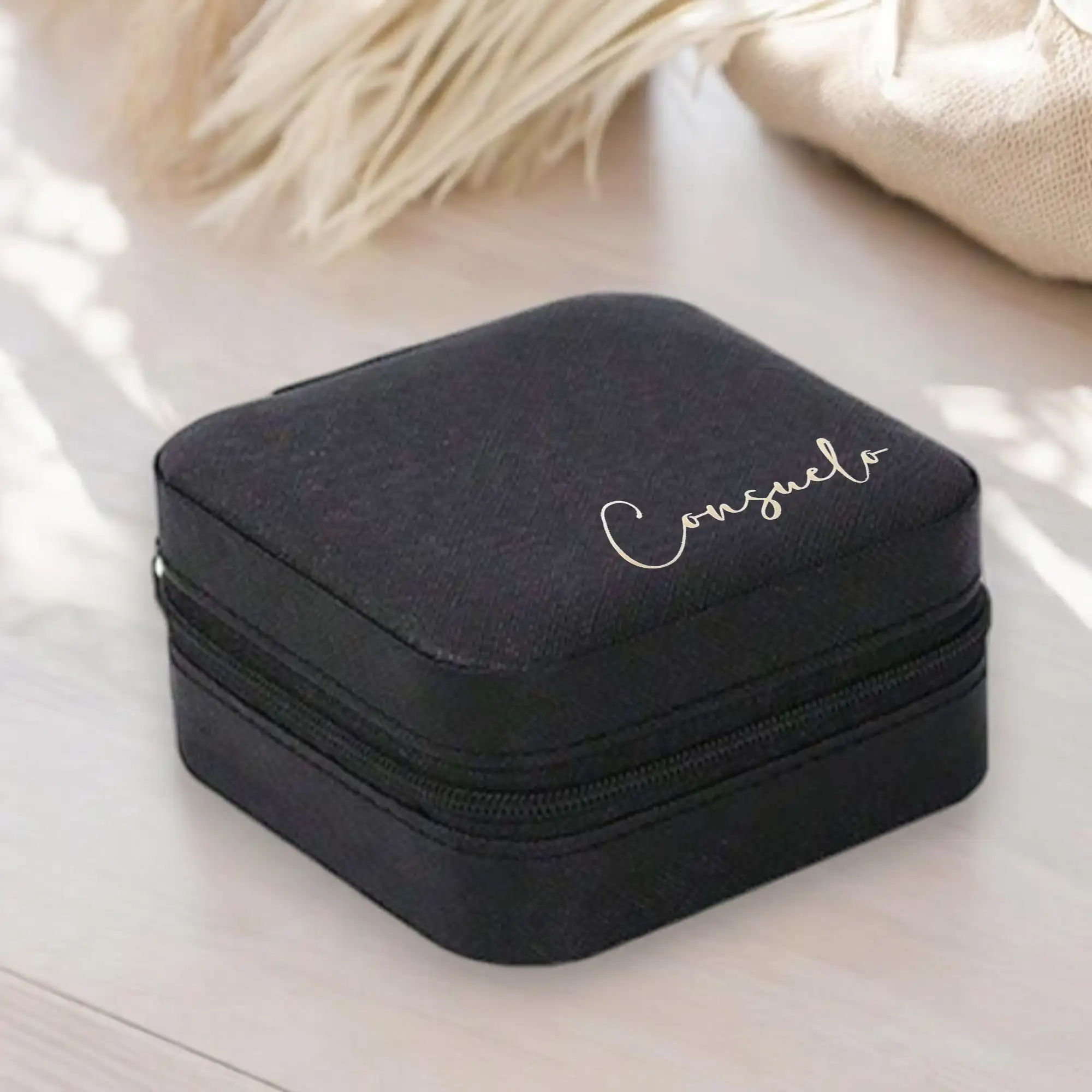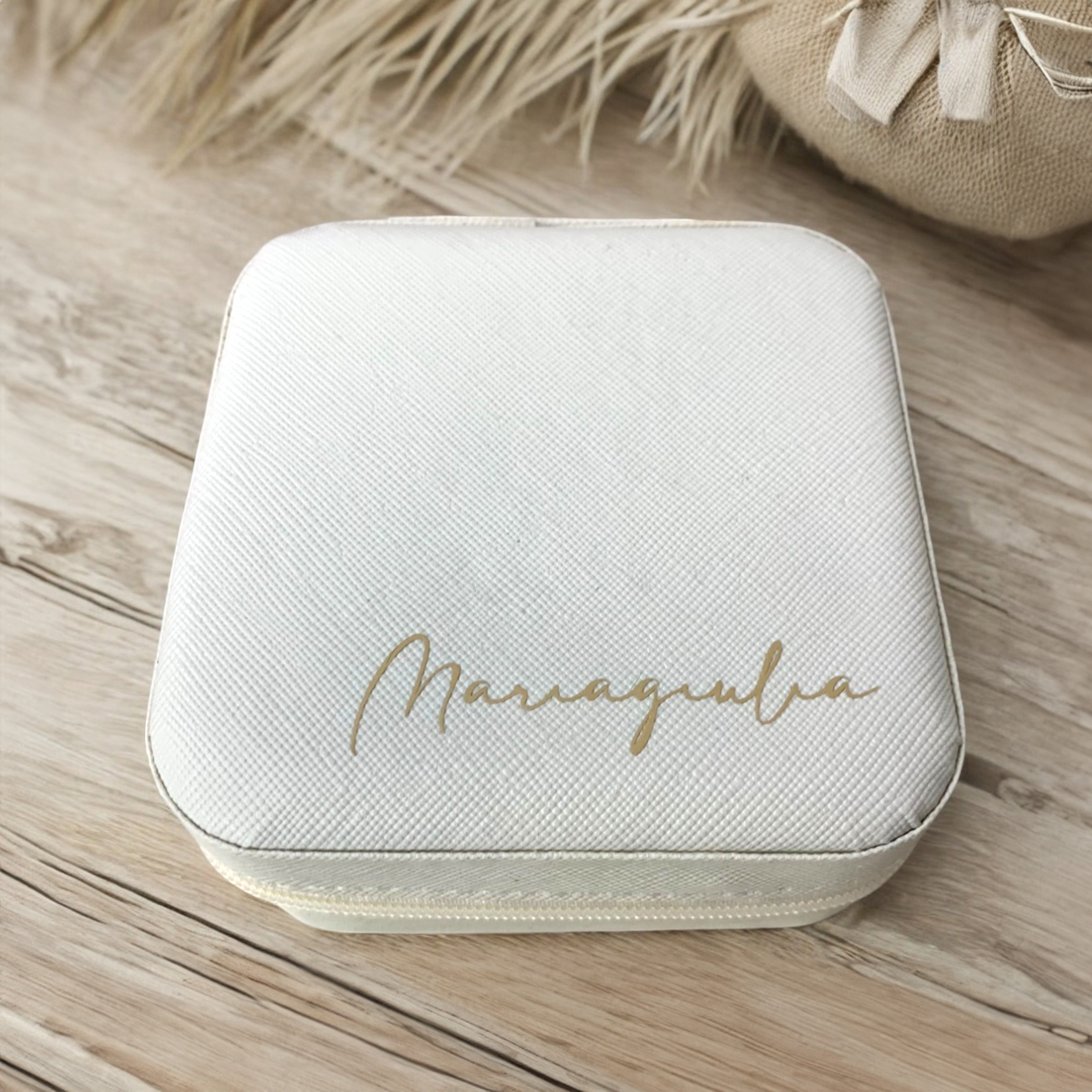 Questo elegante portagioie può essere personalizzato con il nome o le iniziali di tua scelta, stampato con stile sulla superficie. Compatto e discreto, è perfetto per conservare i tuoi gioielli preferiti in modo sicuro, sia a casa che in viaggio. Il design minimal e raffinato lo rende un accessorio funzionale e di stile, ideale come regalo unico e personalizzato per una persona speciale.