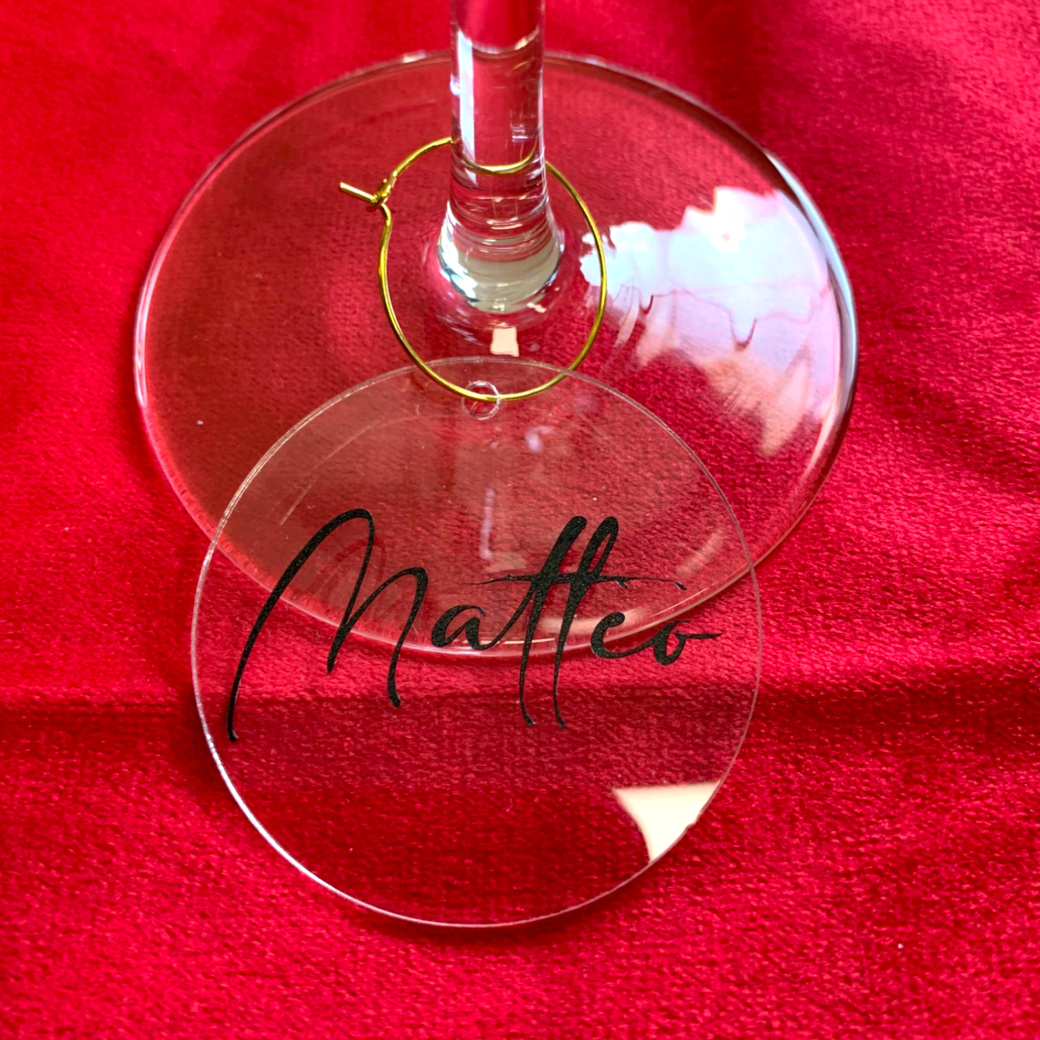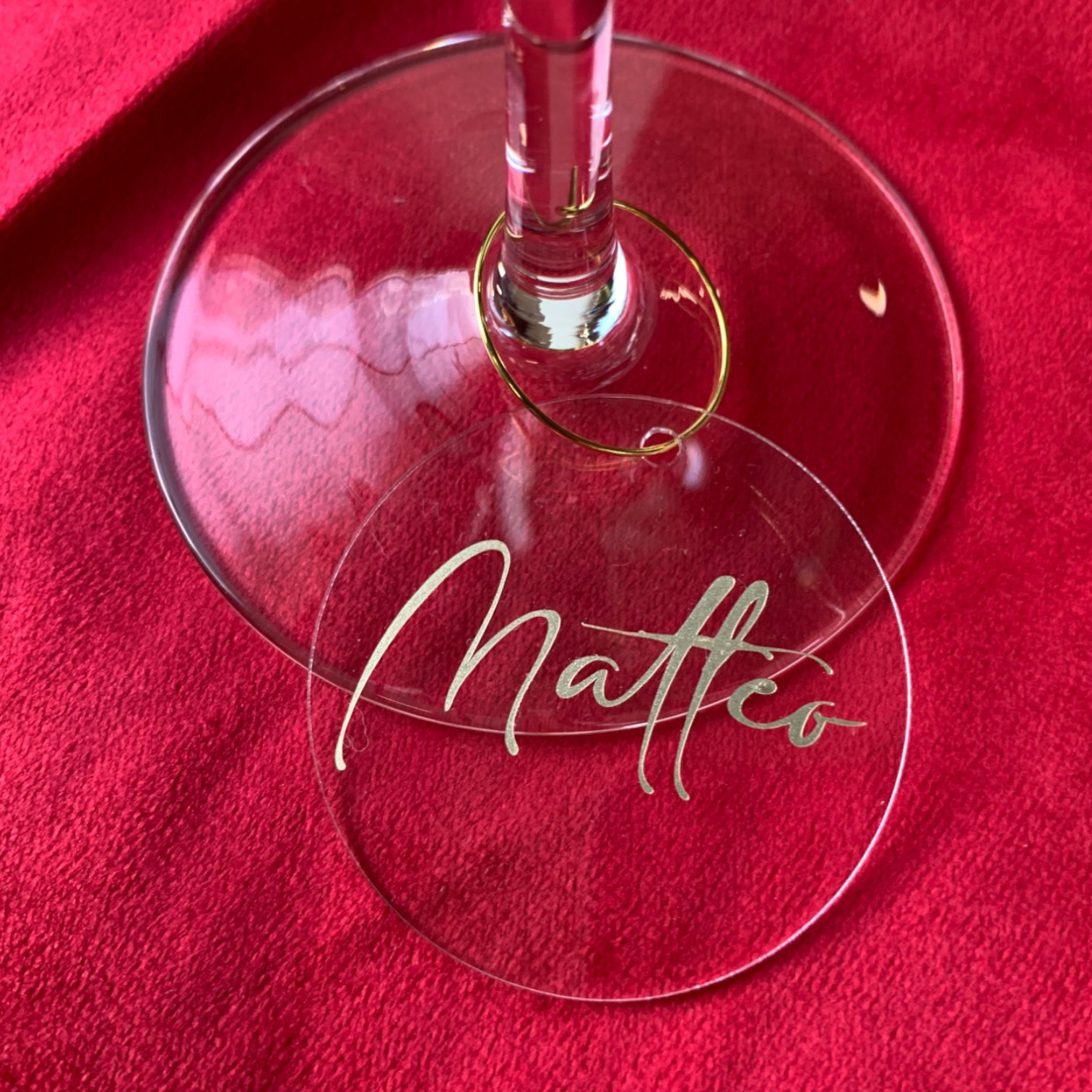 Questo prodotto è un elegante segnaposto realizzato in acrilico/plexiglass trasparente, personalizzabile con il nome desiderato, come nell’esempio “Matteo”. La sua forma circolare lo rende perfetto da agganciare al calice tramite un piccolo foro, aggiungendo un tocco raffinato e personale a ogni tavola apparecchiata. Ideale per eventi speciali come matrimoni, cene di gala o altre occasioni dove l’attenzione ai dettagli è fondamentale. Il materiale in acrilico/plexiglass lo rende resistente e leggero, mantenendo un aspetto moderno e sofisticato.