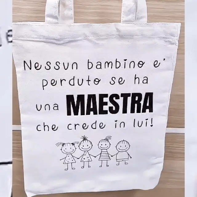 Un set pensato per dire grazie in modo unico: una borsa shopper in cotone con frase dedicata alle maestre e un astuccio bianco personalizzato con il nome della maestra.