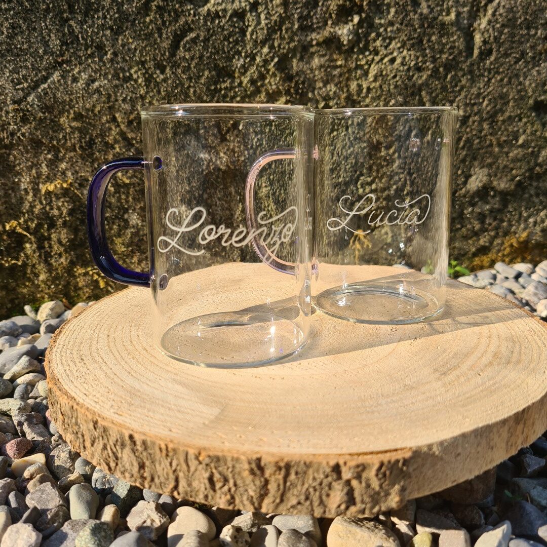 Tazza in vetro da 250ml, personalizzabile con il tuo nome o una frase speciale. Ogni incisione viene realizzata a mano, donando un tocco personale e inconfondibile. È possibile scegliere se lasciare l’incisione al naturale, che si adatta perfettamente alle superfici in vetro, oppure riempirla con oro o argento per un effetto ancora più prezioso. Un’idea regalo unica, perfetta per sorprendere con stile. Manici con colori casuali