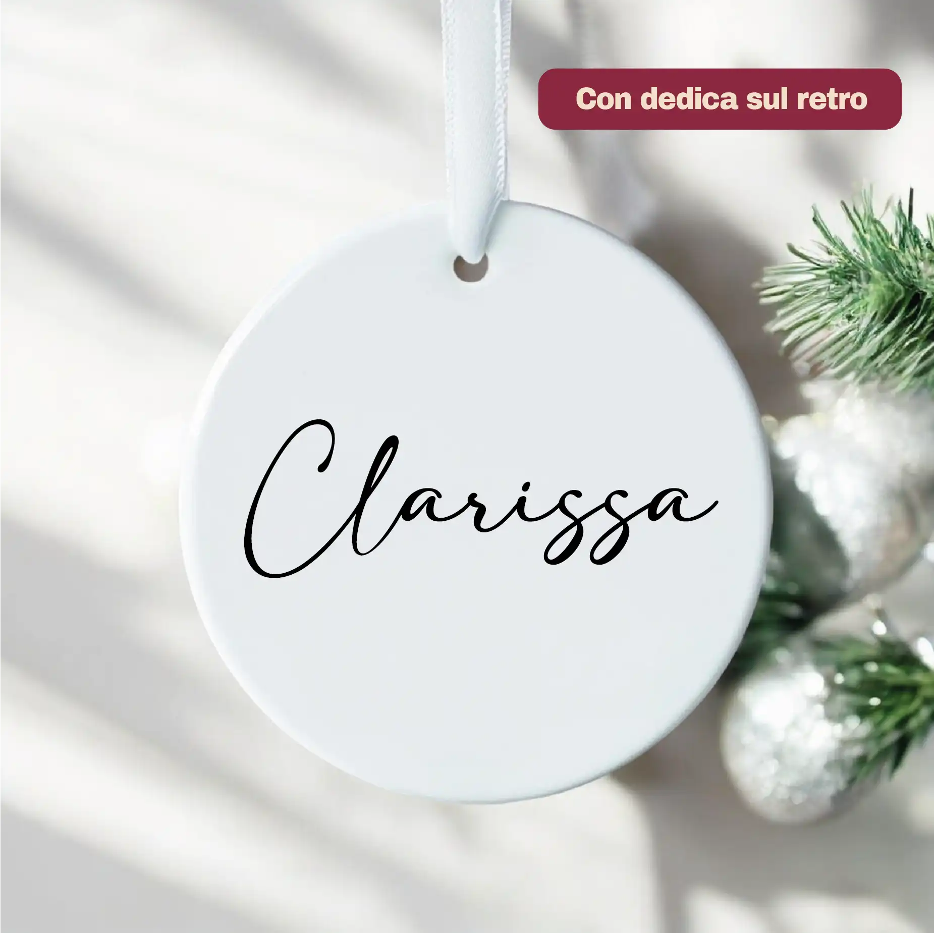 Un elegante ornamento in ceramica, con il nome stampato sulla parte anteriore in un carattere raffinato. Sul retro, una frase significativa è delicatamente impressa, rendendo questo ornamento un ricordo prezioso e personalizzato, perfetto per aggiungere un tocco speciale a qualsiasi occasione.