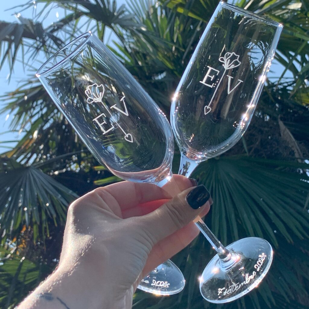 Questa elegante coppia di flûte in vetro è incisa a mano con grande attenzione ai dettagli. Le iniziali personalizzate con un delicato fiore stilizzato e piccoli cuori aggiungono un tocco romantico e unico. Sulla base dei calici sono incisi la data e ulteriori dettagli personalizzati, rendendoli perfetti per commemorare matrimoni, anniversari o altri eventi significativi. Questi calici sono un simbolo raffinato di un amore che dura nel tempo e offrono un modo unico per brindare ai momenti più importanti della vita.